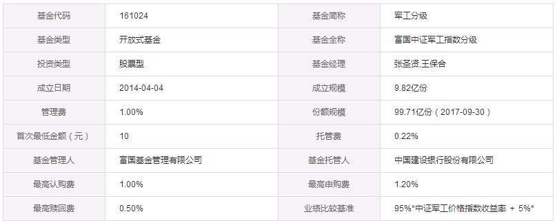 富国中证军工指数分级(161024)全称:富国中证军工指数分级证券投资基金,管理公司:富国基金管理有限公司,截止今日上午富国中证军工指数分级(161024)最新净值:1.0460。